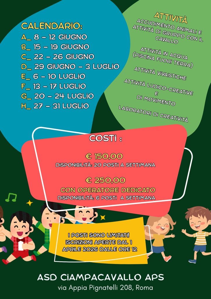Le attività si svolgeranno presso la sede di Via Appia Pignatelli 208, Roma, in un contesto naturale dove sport, relazione con gli animali e laboratori creativi diventano occasione di crescita, gioco e condivisione.